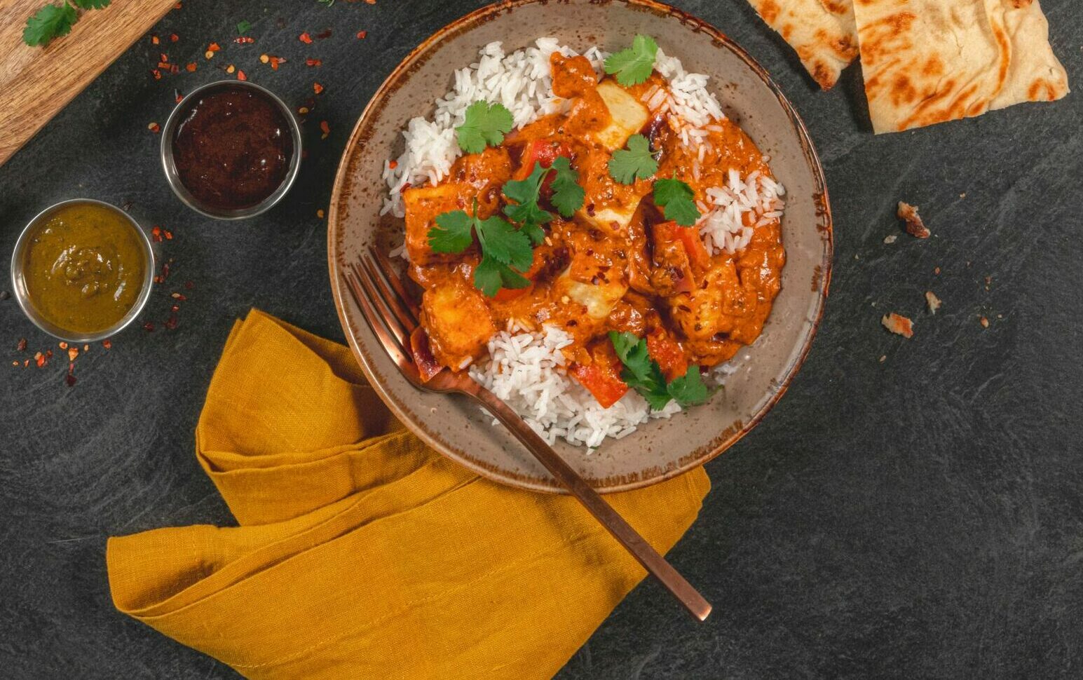 Paneer simmered in a tikka masala sauce with red pepper & red onion. Jasmine rice & naan bread. Substitute tandoori chicken, on us.